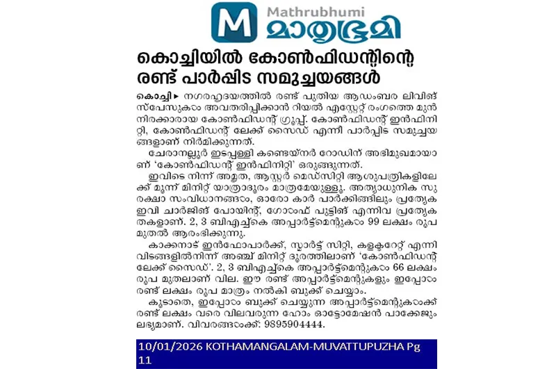 Confident Arina, Trivandrum Launching on 26.05.2017. Price Starts from 37.42 Lakhs